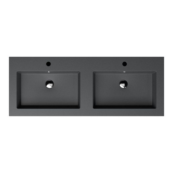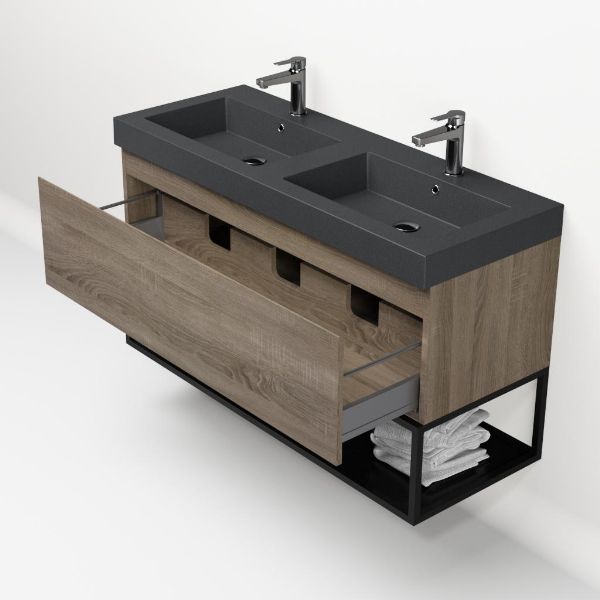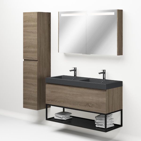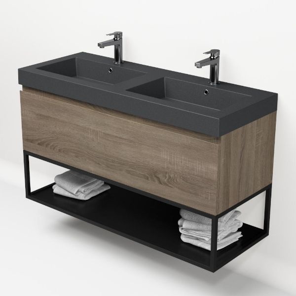 | | Bellanti Solo/Tela/Esta-Q badmeubel 120x46 1 softclose lade eiken donker greeploos quartz wastafel dubbel mat grijs met 2 kraangaten met mat zwart metalen frame |