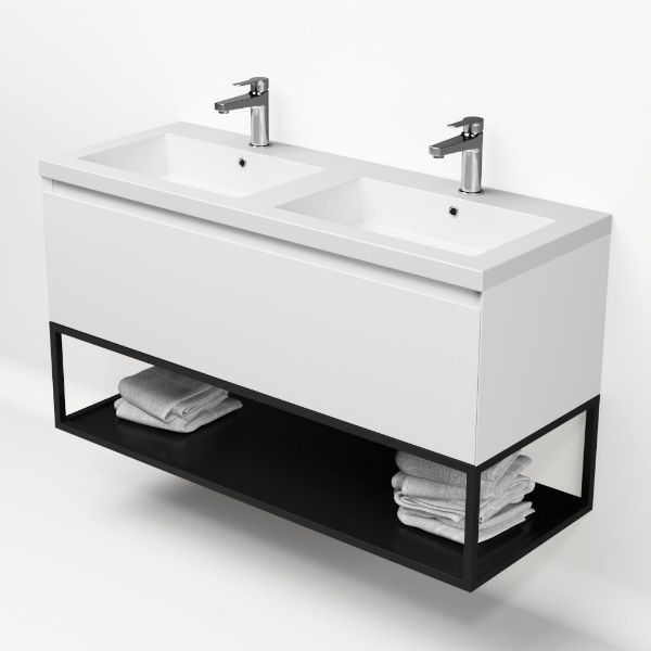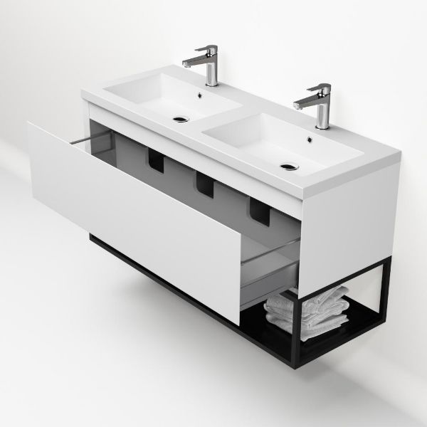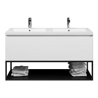 | | Bellanti Solo/Tela/Esta-Q badmeubel 120x46 1 softclose lade wit mat greeploos quartz wastafel dubbel mat wit met 2 kraangaten met mat zwart metalen frame |