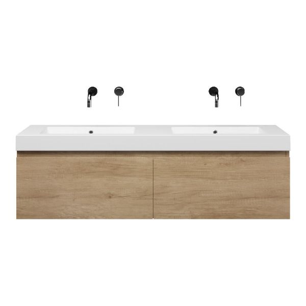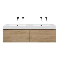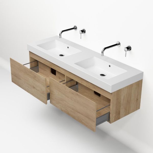 Greeploos badkamermeubel in de kleur olm is 140 cm breed. De wastafel is vervaardig in quartz en heeft de kleur wit mat quartz. Dit badkamermeubel met deze wastafel is leverbaar tussen de 60 cm t/m 160 cm