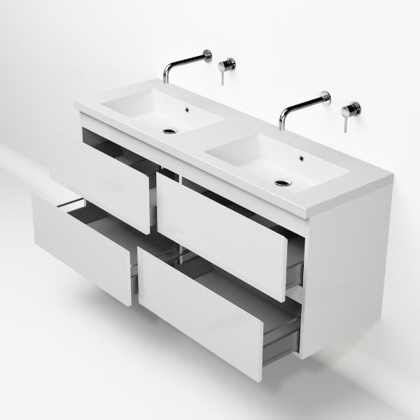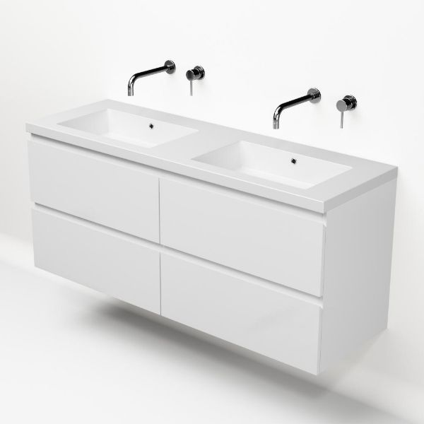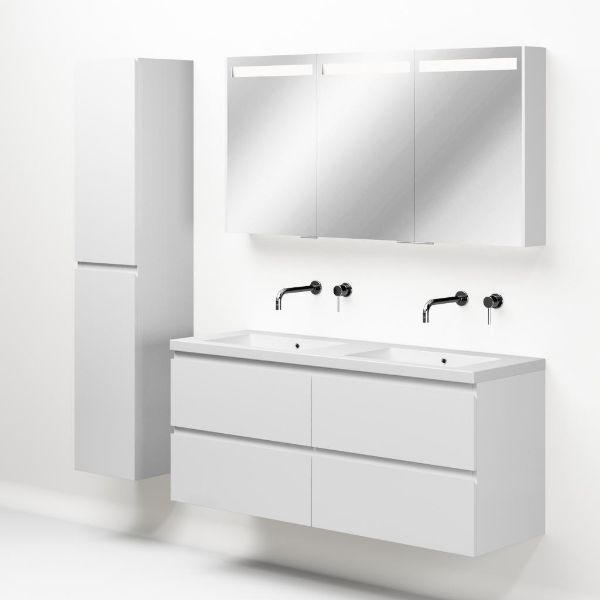 Greeploos badkamermeubel in de kleur wit hoogglans is 140 cm breed. De wastafel is vervaardig in quartz en heeft de kleur wit mat quartz. Dit badkamermeubel met deze wastafel is leverbaar tussen de 60 cm t/m 200 cm