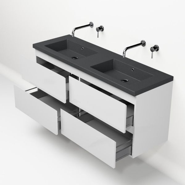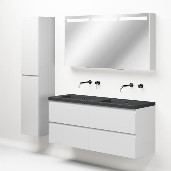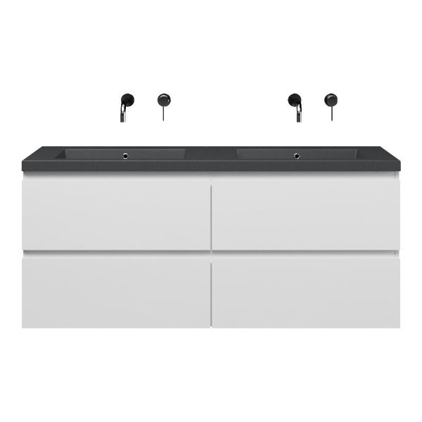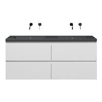 Greeploos badkamermeubel in de kleur wit hoogglans is 140 cm breed.  De wastafel is vervaardig in quartz en heeft de kleur grijs mat quartz. Dit badkamermeubel met deze wastafel is leverbaar tussen de 60 cm t/m 200 cm