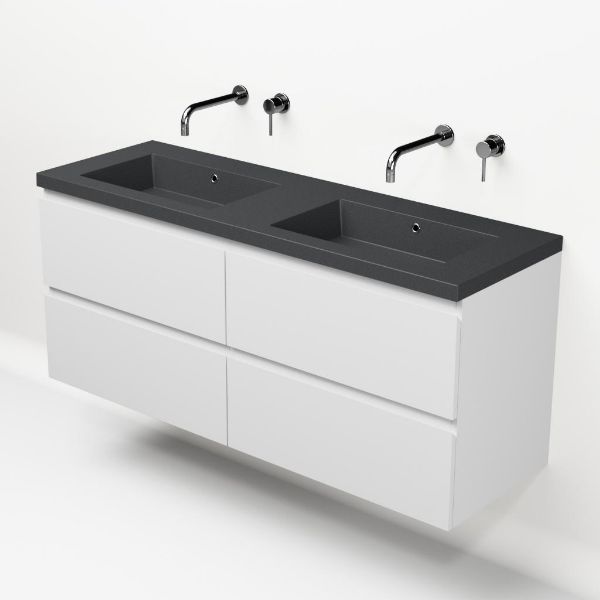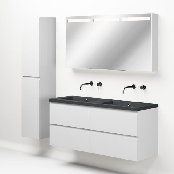 Greeploos badkamermeubel in de kleur wit mat is 140 cm breed. De wastafel is vervaardig in quartz en heeft de kleur grijs mat quartz. Dit badkamermeubel met deze wastafel is leverbaar tussen de 60 cm t/m 200 cm