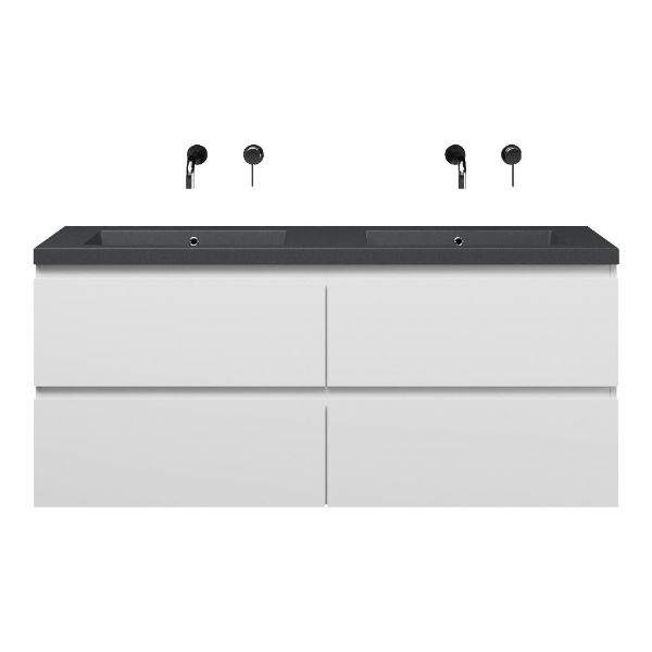 | | Bellanti Gisella/Esta-Q badmeubel 140x46 4 softclose laden wit mat greeploos quartz wastafel dubbel mat grijs zonder kraangaten |