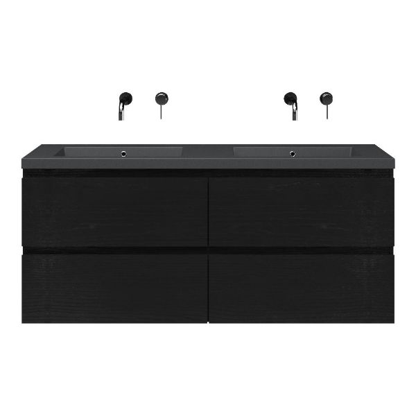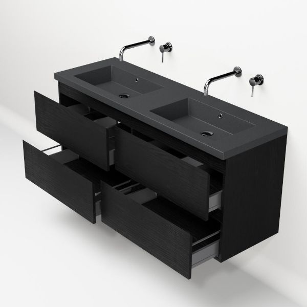 | | Bellanti Gisella/Esta-Q badmeubel 140x46 4 softclose laden zwart mat eiken greeploos quartz wastafel dubbel mat grijs zonder kraangaten |