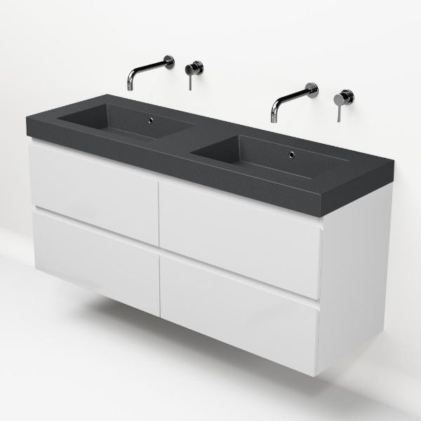 Greeploos badkamermeubel in de kleur wit hoogglans is 140 cm breed. De wastafel is vervaardig in quartz en heeft de kleur grijs mat quartz. Dit badkamermeubel met deze wastafel is leverbaar tussen de 60 cm t/m 200 cm