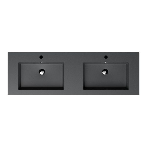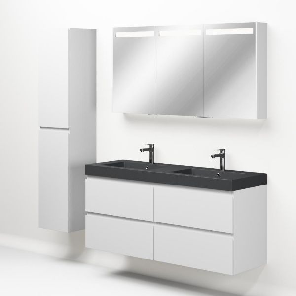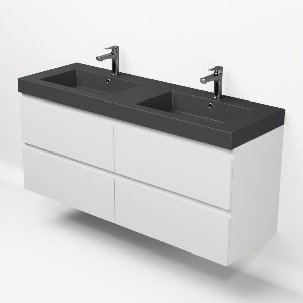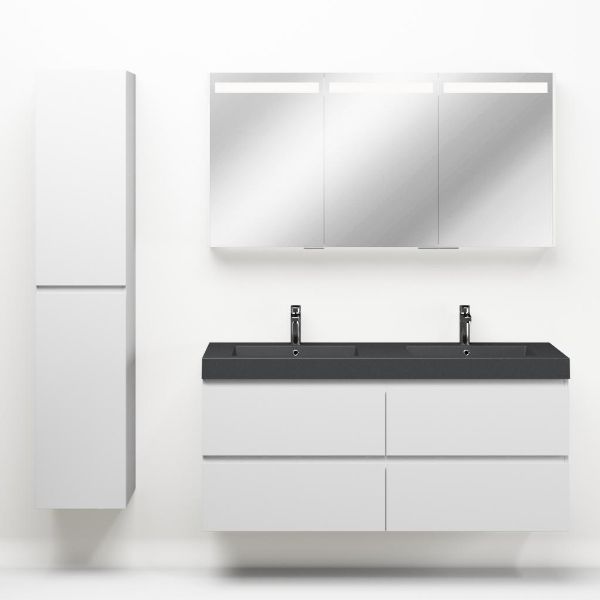 Greeploos badkamermeubel in de kleur wit mat is 140 cm breed. De wastafel is vervaardig in quartz en heeft de kleur grijs mat. Dit badkamermeubel met deze wastafel is leverbaar tussen de 60 cm t/m 200 cm