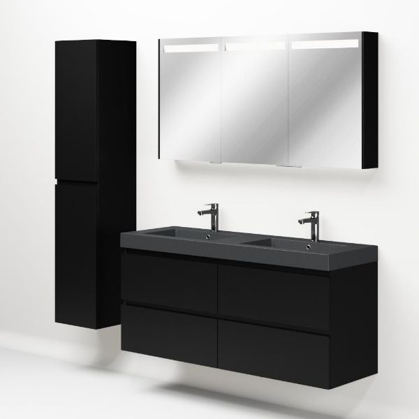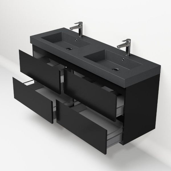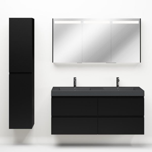 Greeploos badkamermeubel in de kleur zwart mat is 140 cm breed.  De wastafel is vervaardig in quartz en heeft de kleur grijs mat. Dit badkamermeubel met deze wastafel is leverbaar tussen de 60 cm t/m 200 cm