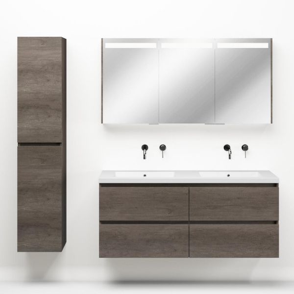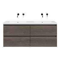 Greeploos badkamermeubel in de kleur olm donker grijs is 140 cm breed.  De wastafel is vervaardig in quartz en heeft de kleur wit mat quartz. Dit badkamermeubel met deze wastafel is leverbaar tussen de 60 cm t/m 200 cm