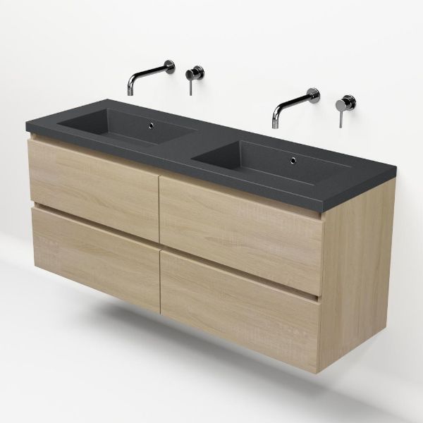 | Bellanti Elena/Esta-Q badmeubel 140x46 4 softclose laden licht eiken greeploos quartz wastafel dubbel mat grijs zonder kraangaten |