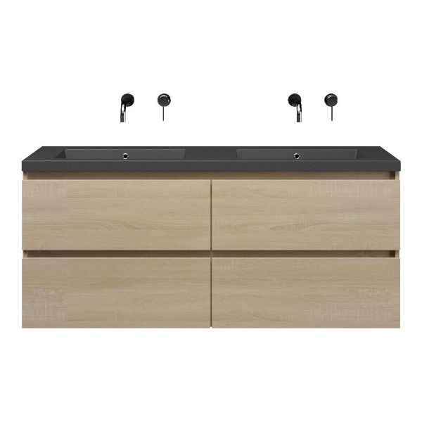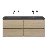 | | Bellanti Elena/Esta-Q badmeubel 140x46 4 softclose laden licht eiken greeploos quartz wastafel dubbel mat grijs zonder kraangaten |