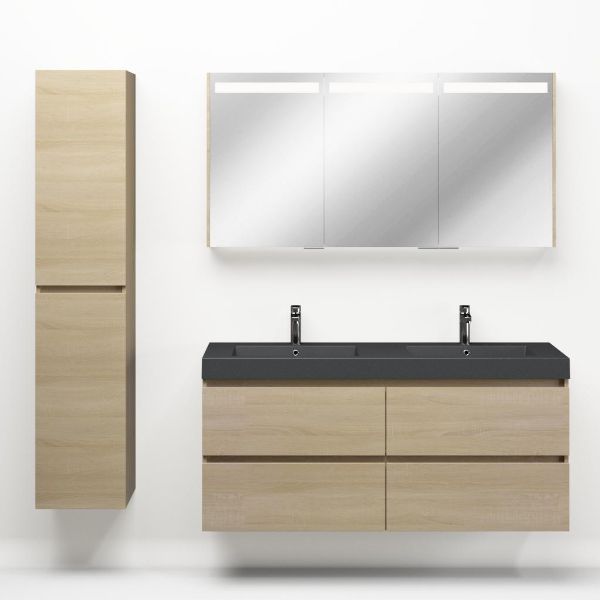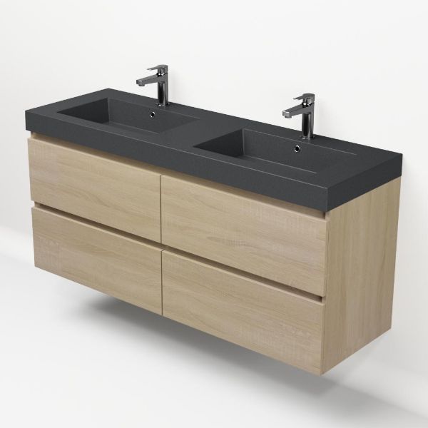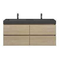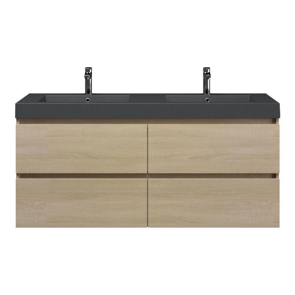 Bellanti Elena/Esta-Q badmeubel 140x46 4 softclose laden licht eiken greeploos polystone wastafel dubbel mat grijs met 2 kraangaten