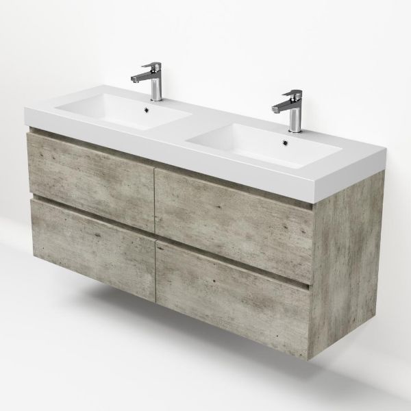 Greeploos badkamermeubel in de kleur steigerhout licht grijs is 140 cm breed.  De wastafel is vervaardig in quartz en heeft de kleur wit mat. Dit badkamermeubel met deze wastafel is leverbaar tussen de 60 cm t/m 200 cm
