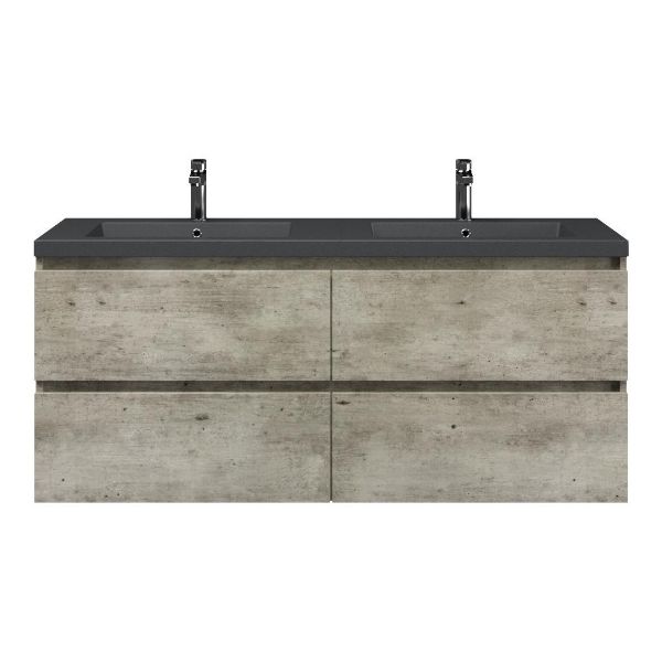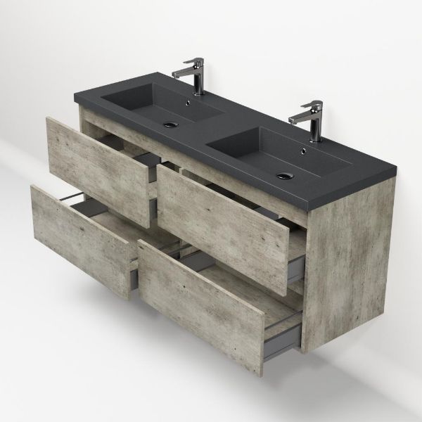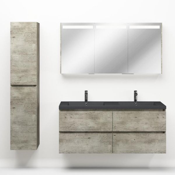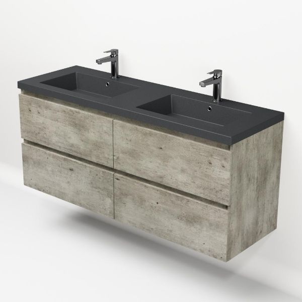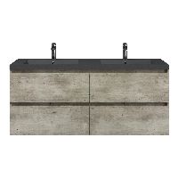 Greeploos badkamermeubel in de kleur steigerhout licht grijs is 140 cm breed.  De wastafel is vervaardig in quartz en heeft de kleur grijs mat. Dit badkamermeubel met deze wastafel is leverbaar tussen de 60 cm t/m 200 cm