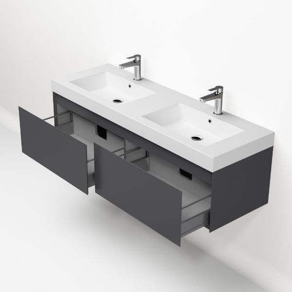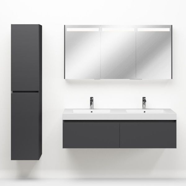Greeploos badkamermeubel in de kleur antraciet mat is 140 cm breed.  De wastafel is vervaardig in quartz en heeft de kleur wit mat. Dit badkamermeubel met deze wastafel is leverbaar tussen de 60 cm t/m 160 cm