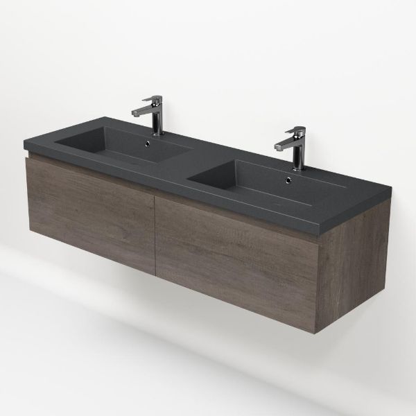 Greeploos badkamermeubel in de kleur olm donker grijs is 140 cm breed.  De wastafel is vervaardig in quartz en heeft de kleur grijs mat. Dit badkamermeubel met deze wastafel is leverbaar tussen de 60 cm t/m 160 cm