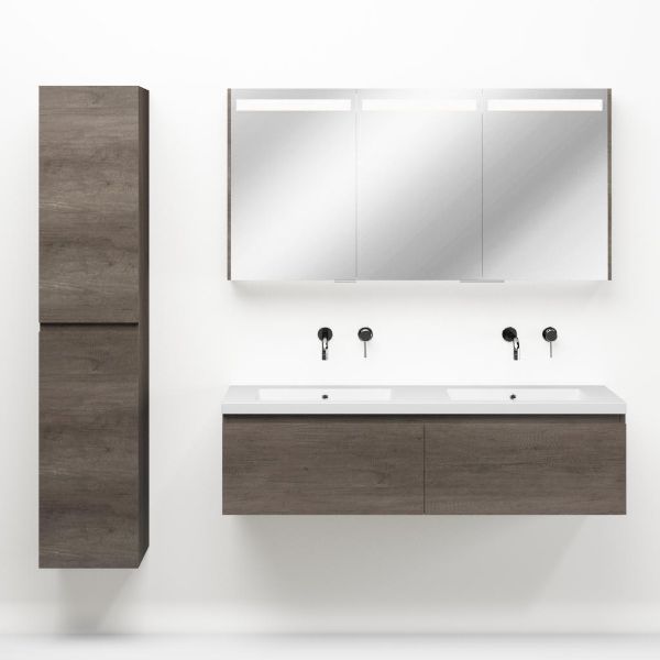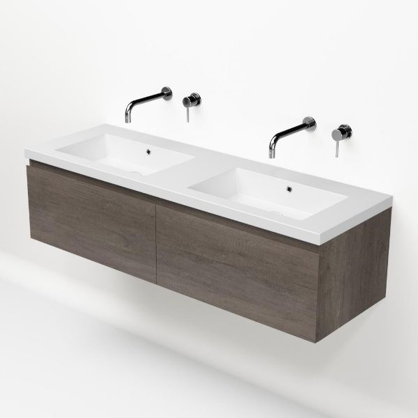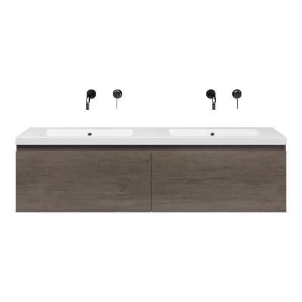 Greeploos badkamermeubel in de kleur olm donker grijs is 140 cm breed. De wastafel is vervaardig in quartz en heeft de kleur wit mat quartz. Dit badkamermeubel met deze wastafel is leverbaar tussen de 60 cm t/m 160 cm