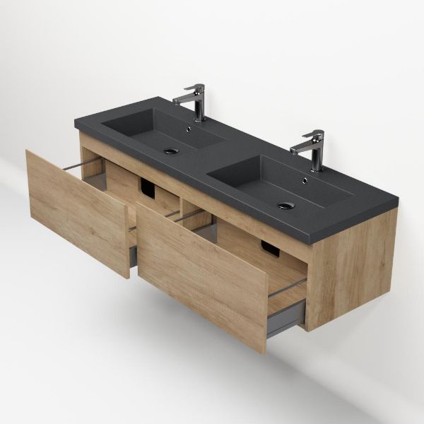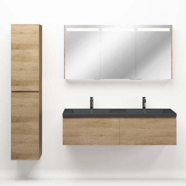 Greeploos badkamermeubel in de kleur olm is 140 cm breed. De wastafel is vervaardig in quartz en heeft de kleur grijs mat. Dit badkamermeubel met deze wastafel is leverbaar tussen de 60 cm t/m 160 cm