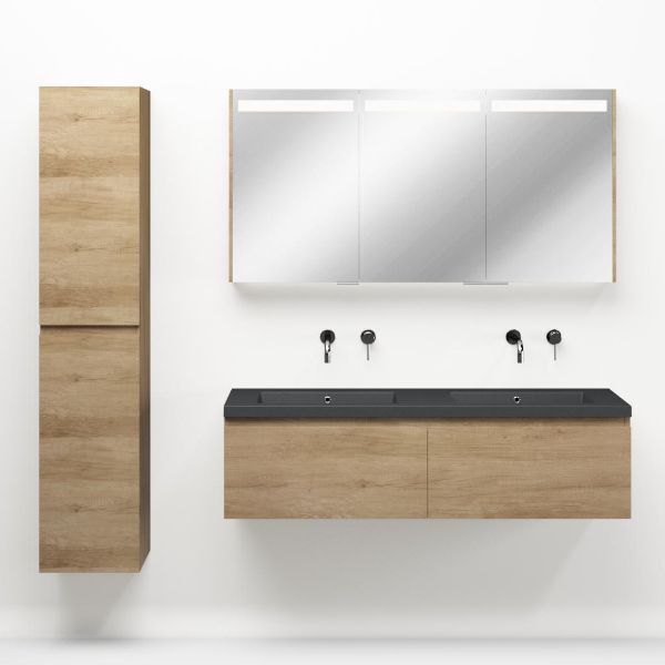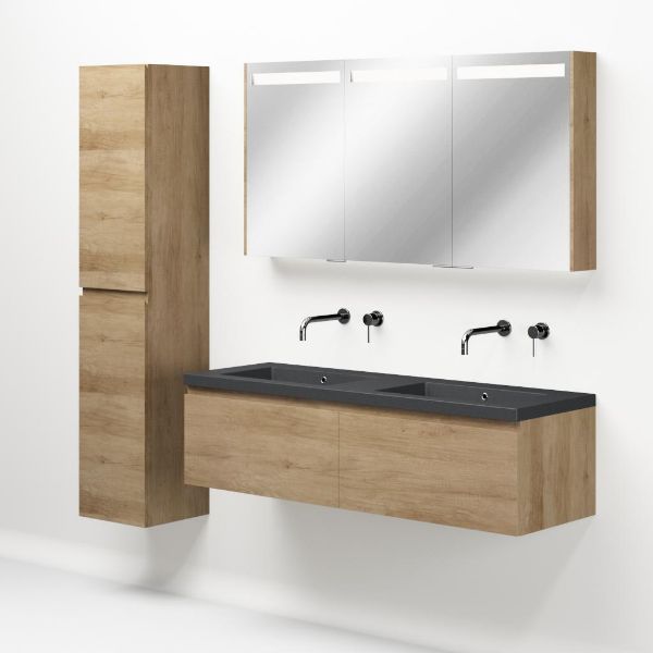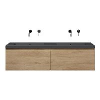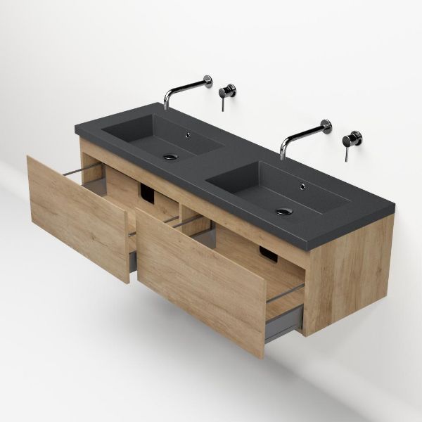 Greeploos badkamermeubel in de kleur olm is 140 cm breed. De wastafel is vervaardig in quartz en heeft de kleur grijs mat quartz. Dit badkamermeubel met deze wastafel is leverbaar tussen de 60 cm t/m 160 cm