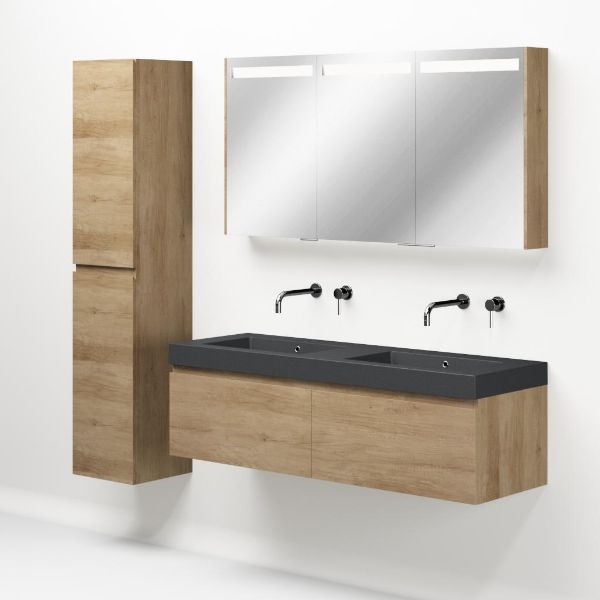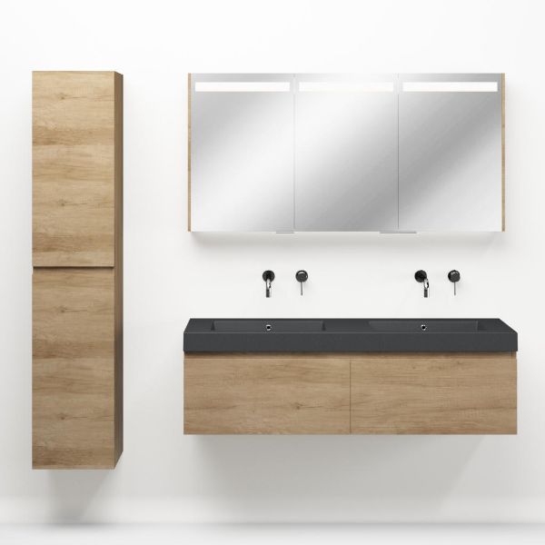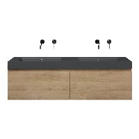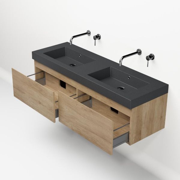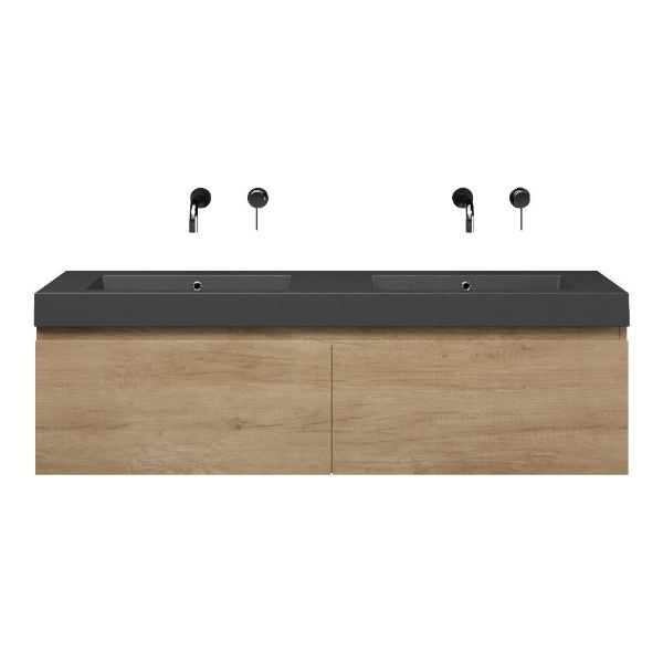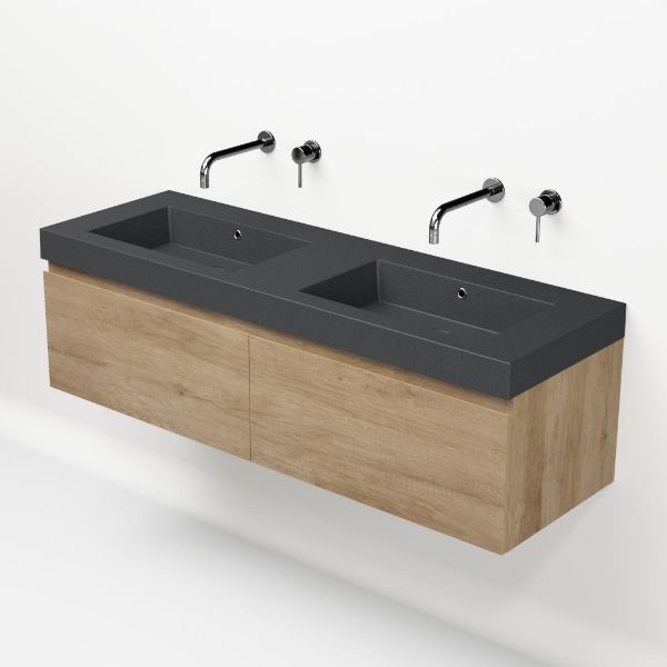 Greeploos badkamermeubel in de kleur olm is 140 cm breed.  De wastafel is vervaardig in quartz en heeft de kleur grijs mat quartz. Dit badkamermeubel met deze wastafel is leverbaar tussen de 60 cm t/m 160 cm