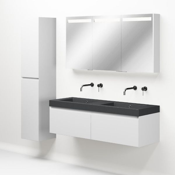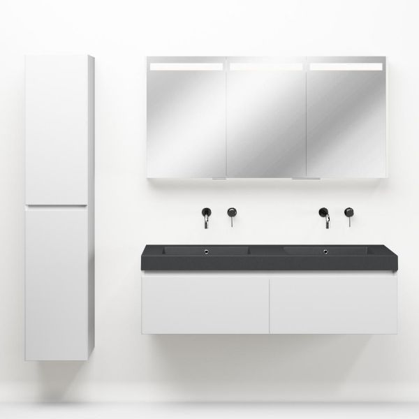 Greeploos badkamermeubel in de kleur wit mat is 140 cm breed.  De wastafel is vervaardig in quartz en heeft de kleur grijs mat quartz. Dit badkamermeubel met deze wastafel is leverbaar tussen de 60 cm t/m 160 cm