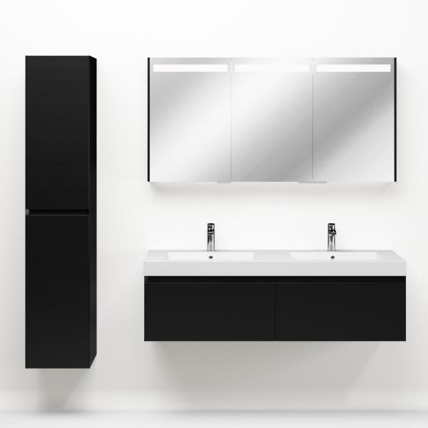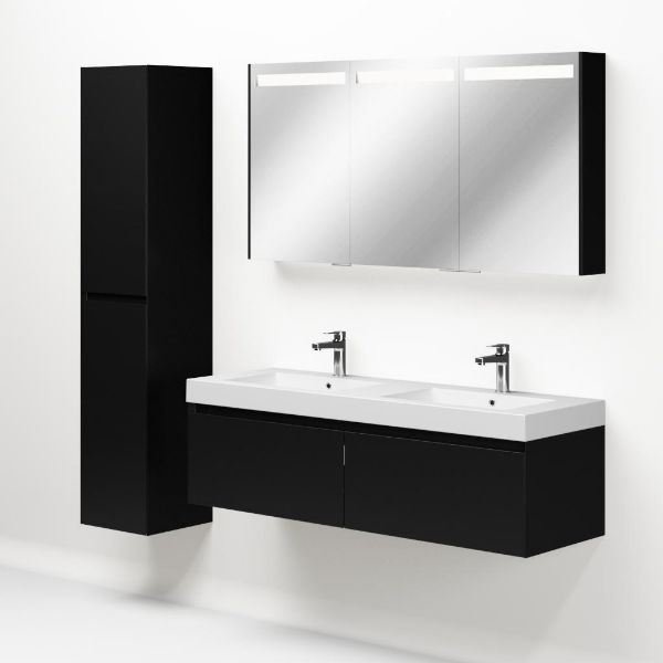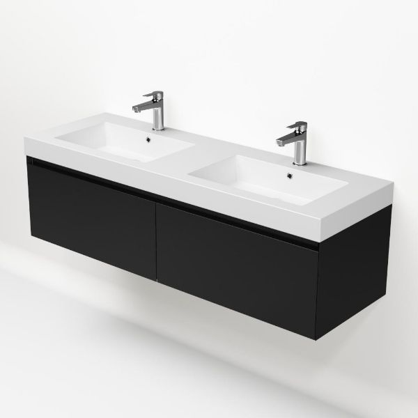 Greeploos badkamermeubel in de kleur zwart mat is 140 cm breed.  De wastafel is vervaardig in quartz en heeft de kleur wit mat. Dit badkamermeubel met deze wastafel is leverbaar tussen de 60 cm t/m 160 cm