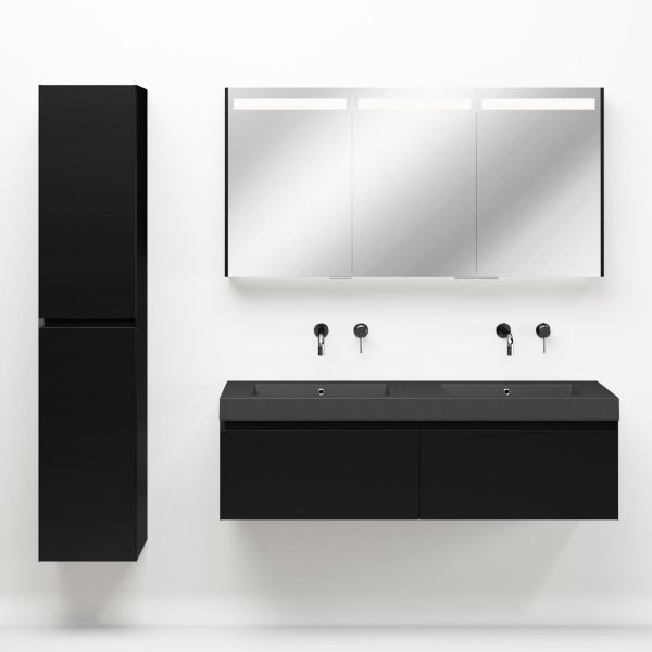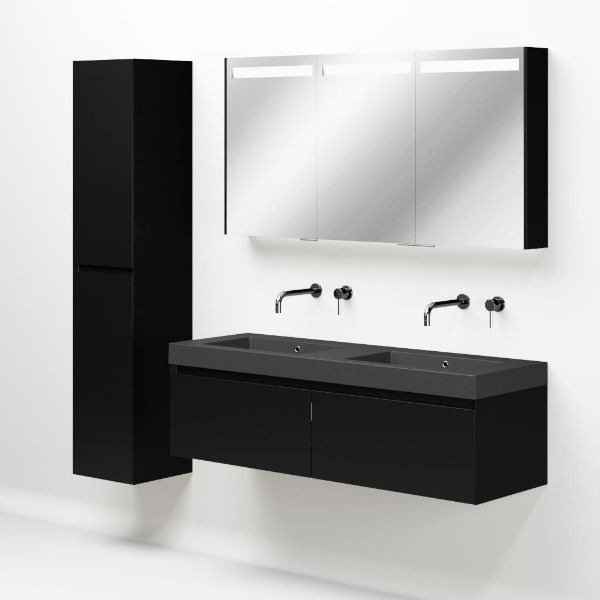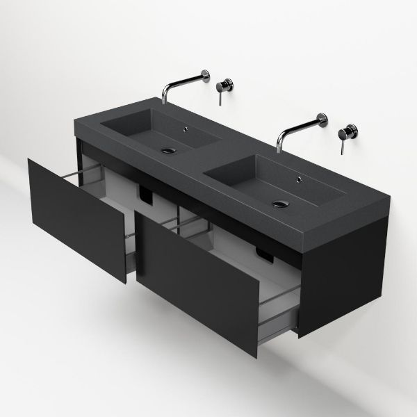 Greeploos badkamermeubel in de kleur zwart mat is 140 cm breed. De wastafel is vervaardig in quartz en heeft de kleur grijs mat quartz. Dit badkamermeubel met deze wastafel is leverbaar tussen de 60 cm t/m 160 cm