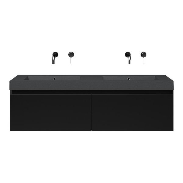 | | Bellanti Solo/Esta-Q badmeubel 140x46 2 softclose laden zwart mat greeploos quartz wastafel dubbel mat grijs zonder kraangaten |