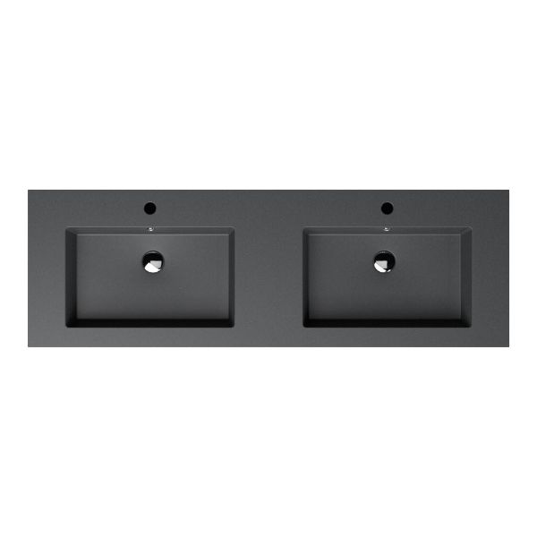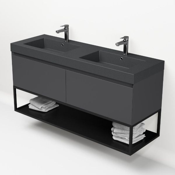 Bellanti Solo/Tela/Esta-Q badmeubel 140x46 2 softclose laden antraciet mat greeploos polystone wastafel dubbel mat grijs met 2 kraangaten met mat zwart metalen frame