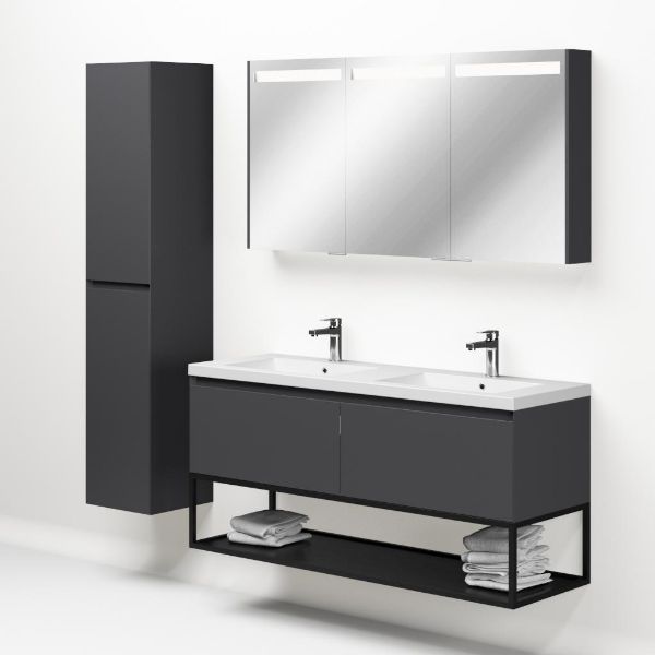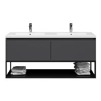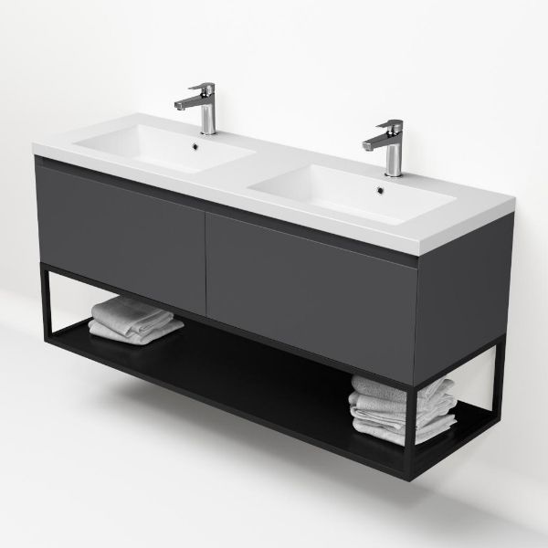 Bellanti Solo/Tela/Esta-Q badmeubel 140x46 2 softclose laden antraciet mat greeploos polystone wastafel dubbel mat wit met 2 kraangaten met mat zwart metalen frame