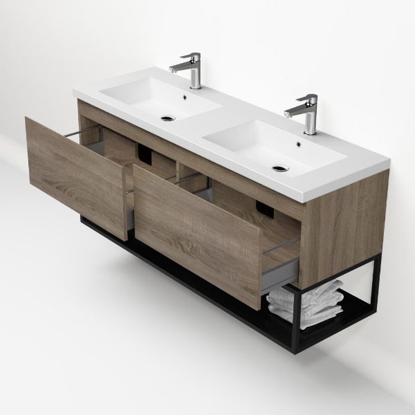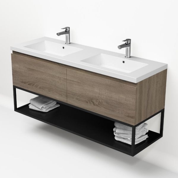 | | Bellanti Solo/Tela/Esta-Q badmeubel 140x46 2 softclose laden eiken donker greeploos polystone wastafel dubbel mat wit met 2 kraangaten met mat zwart metalen frame |