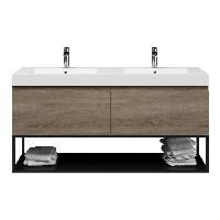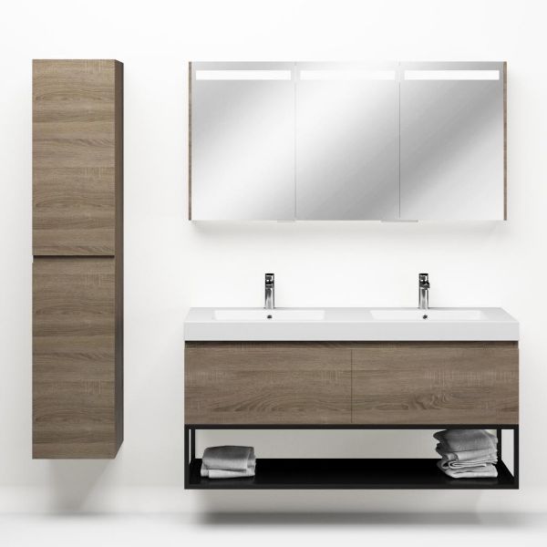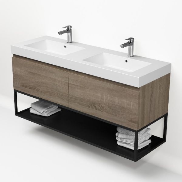 Bellanti Solo/Tela/Esta-Q badmeubel 140x46 2 softclose laden eiken donker greeploos polystone wastafel dubbel mat wit met 2 kraangaten met mat zwart metalen frame