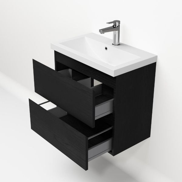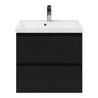 Ondiepe greeploos badkamermeubel in de kleur zwart mat eiken. Badmeubel is praktisch voor een compact badkamer. Het meubel van 60 cm breed is er. De wastafel is vervaardig in polystone en heeft de kleur wit. Dit badkamermeubel met deze wastafel is leverbaar tussen de 60 cm t/m 100 cm.