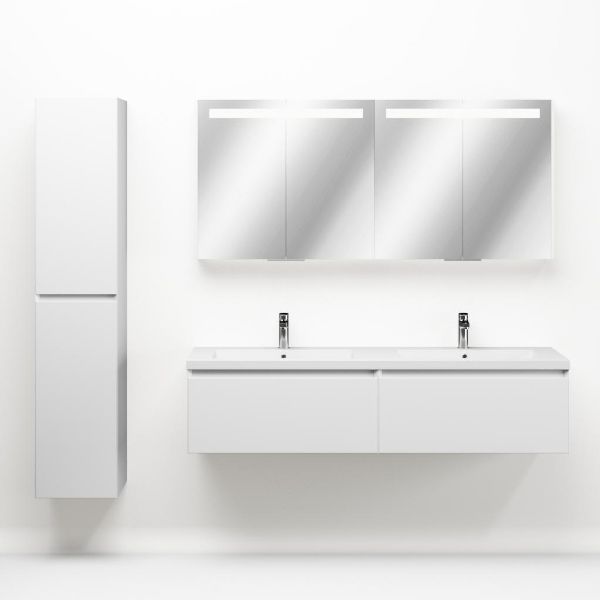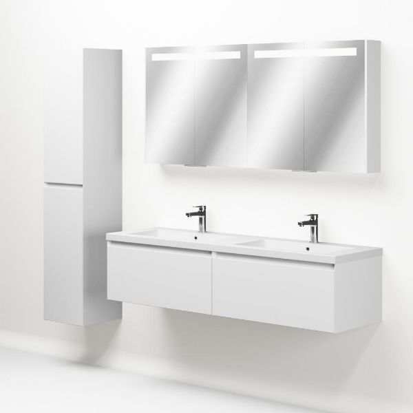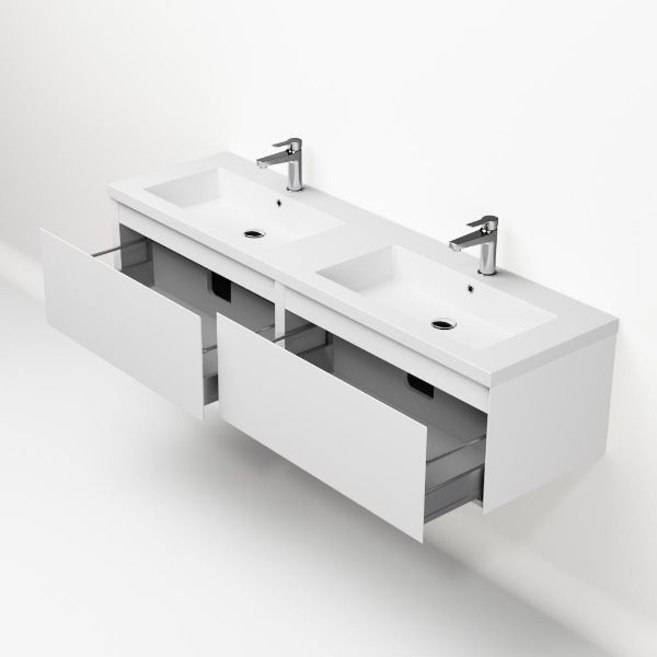 Greeploos badkamermeubel in de kleur wit mat is 160 cm breed. De wastafel is vervaardig in polystone en heeft de kleur wit. Dit badkamermeubel met deze wastafel is leverbaar tussen de 60 cm t/m 160 cm