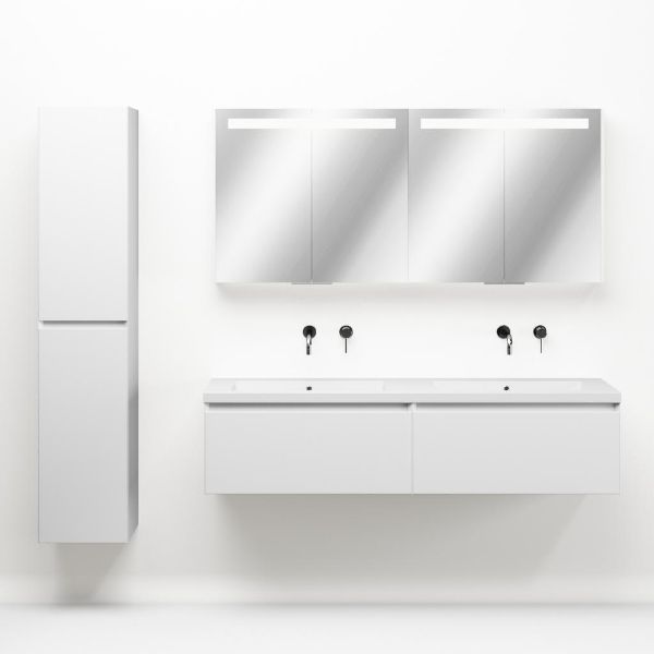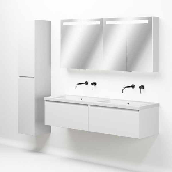 Greeploos badkamermeubel in de kleur wit mat is 160 cm breed. De wastafel is vervaardig in polystone en heeft de kleur wit. Dit badkamermeubel met deze wastafel is leverbaar tussen de 60 cm t/m 160 cm