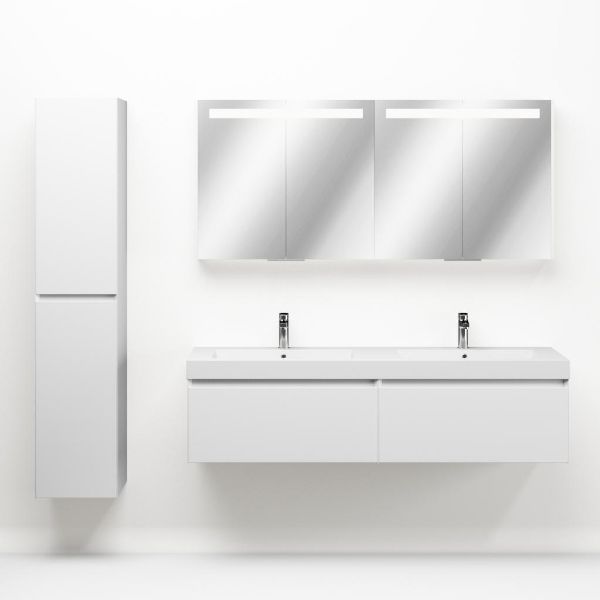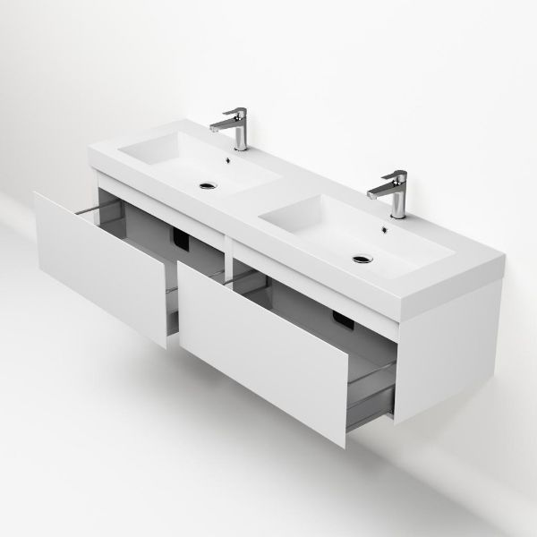 Greeploos badkamermeubel in de kleur wit mat is 160 cm breed. De wastafel is vervaardig in polystone en heeft de kleur wit. Dit badkamermeubel met deze wastafel is leverbaar tussen de 60 cm t/m 160 cm