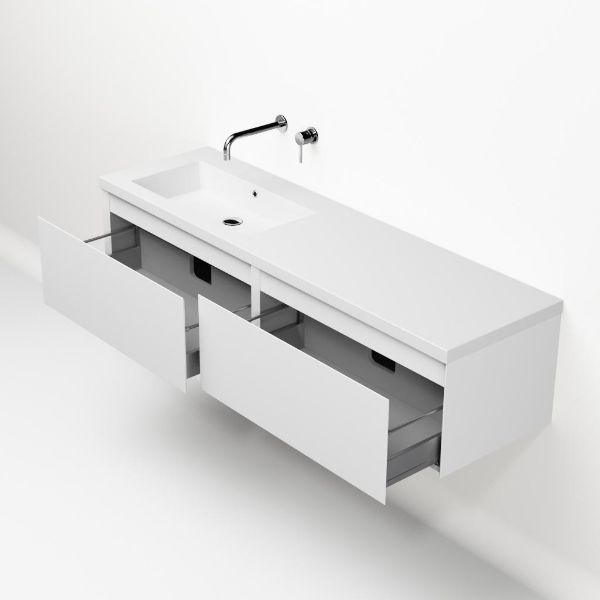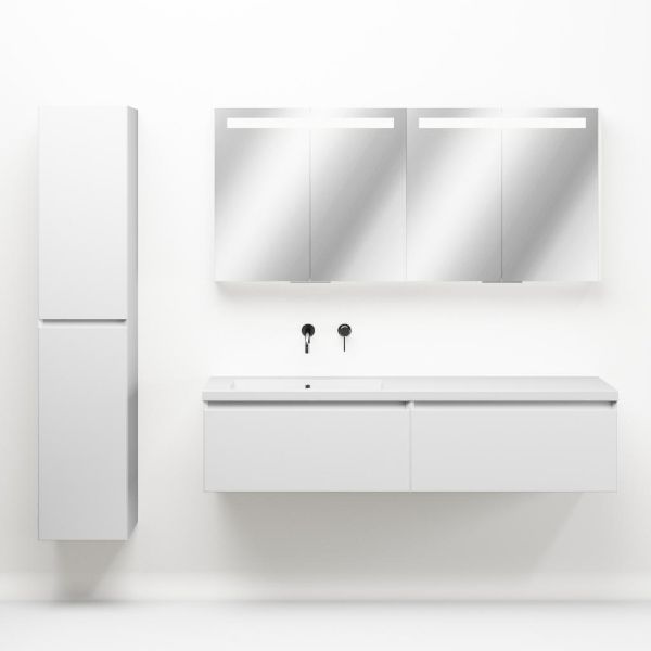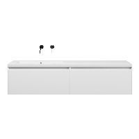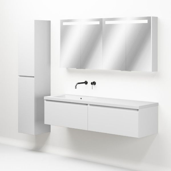 Greeploos badkamermeubel in de kleur wit mat is 160 cm breed. De wastafel is vervaardig in polystone en heeft de kleur wit. Dit badkamermeubel met deze wastafel is leverbaar tussen de 60 cm t/m 160 cm