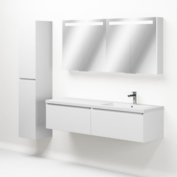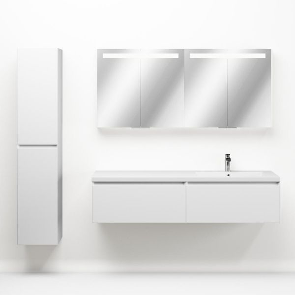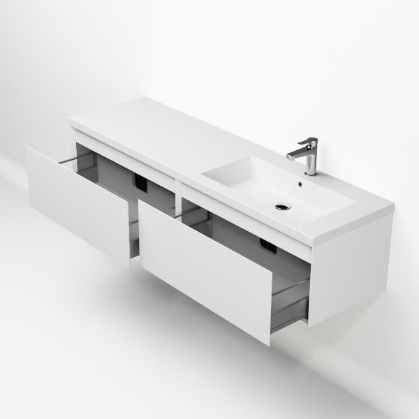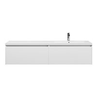 Greeploos badkamermeubel in de kleur wit mat is 160 cm breed.  De wastafel is vervaardig in polystone en heeft de kleur wit. Dit badkamermeubel met deze wastafel is leverbaar tussen de 60 cm t/m 160 cm
