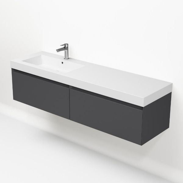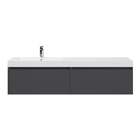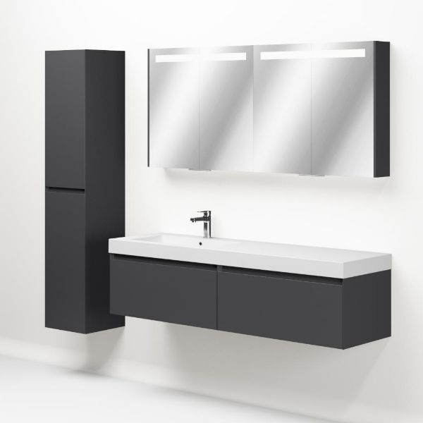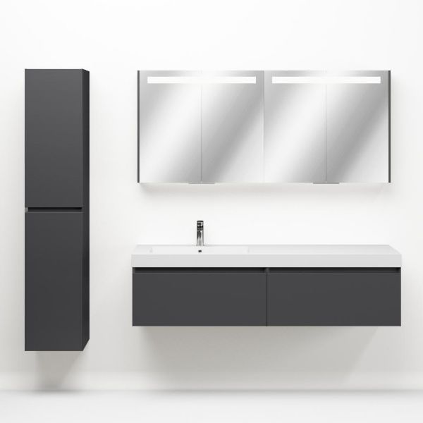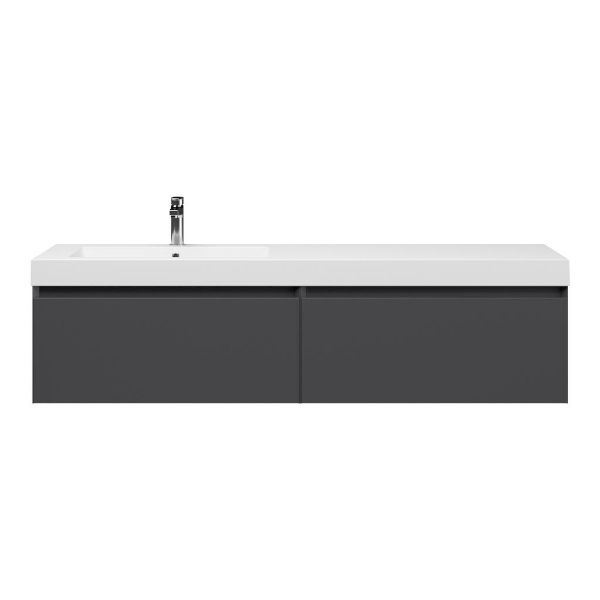 Greeploos badkamermeubel in de kleur antraciet mat is 160 cm breed. De wastafel is vervaardig in polystone en heeft de kleur wit. Dit badkamermeubel met deze wastafel is leverbaar tussen de 60 cm t/m 160 cm