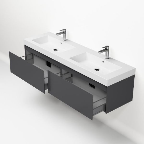 Greeploos badkamermeubel in de kleur antraciet mat is 160 cm breed. De wastafel is vervaardig in polystone en heeft de kleur wit. Dit badkamermeubel met deze wastafel is leverbaar tussen de 60 cm t/m 160 cm