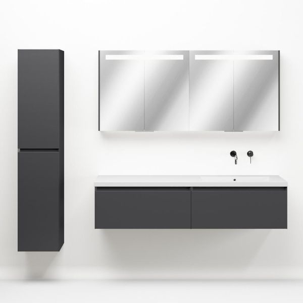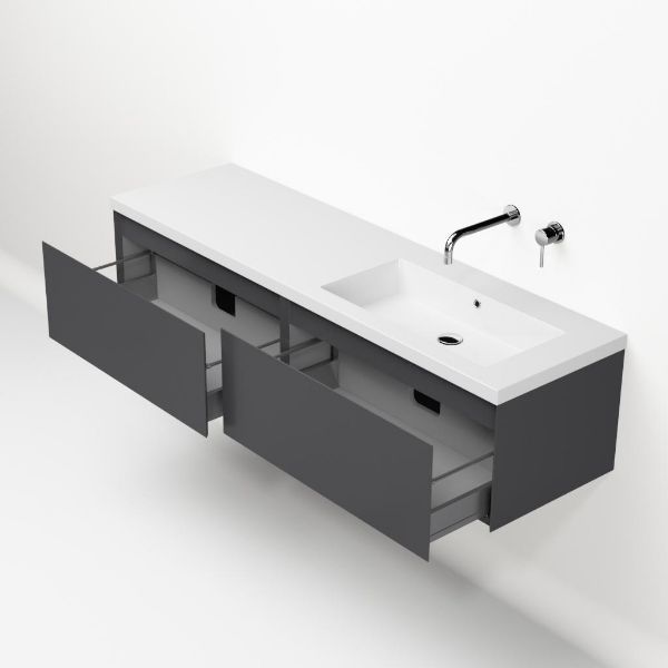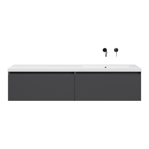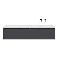 Greeploos badkamermeubel in de kleur antraciet mat is 160 cm breed.  De wastafel is vervaardig in polystone en heeft de kleur wit. Dit badkamermeubel met deze wastafel is leverbaar tussen de 60 cm t/m 160 cm