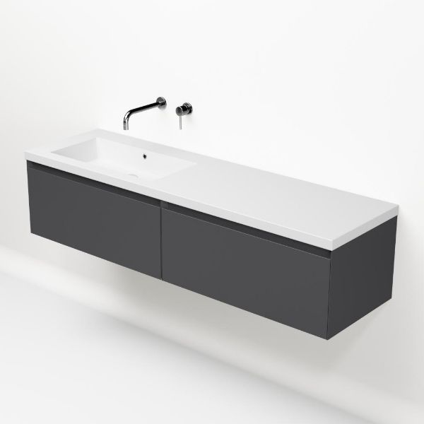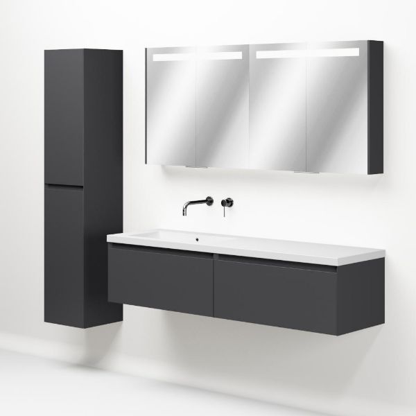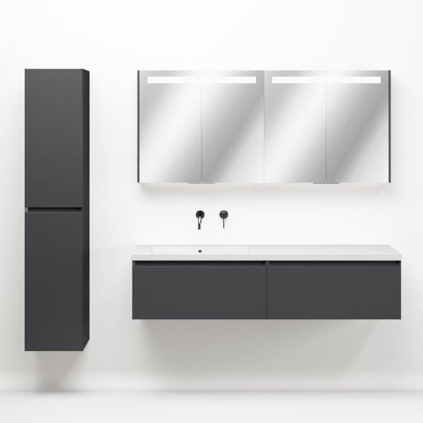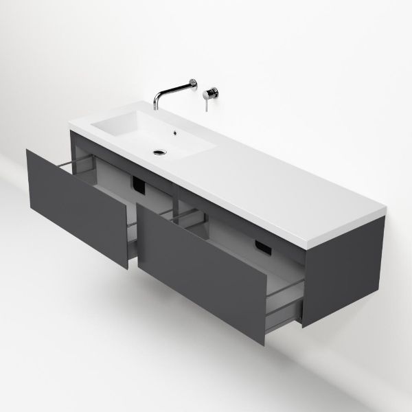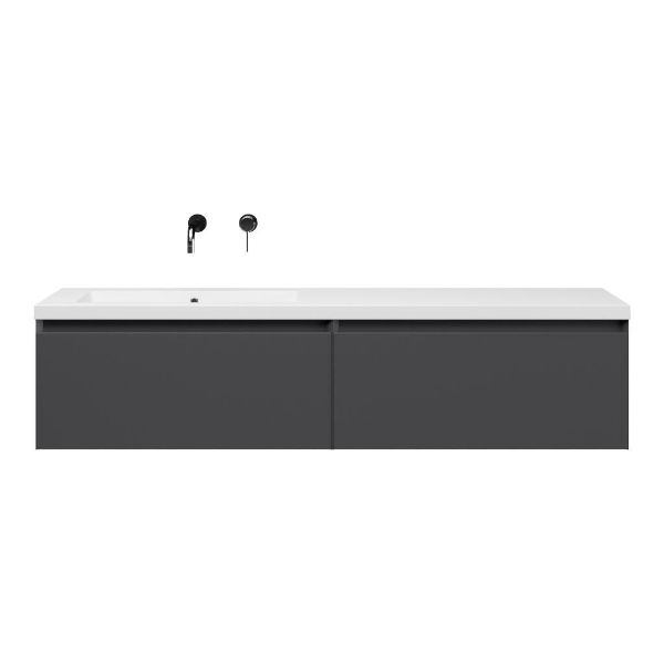Greeploos badkamermeubel in de kleur antraciet mat is 160 cm breed.  De wastafel is vervaardig in polystone en heeft de kleur wit. Dit badkamermeubel met deze wastafel is leverbaar tussen de 60 cm t/m 160 cm