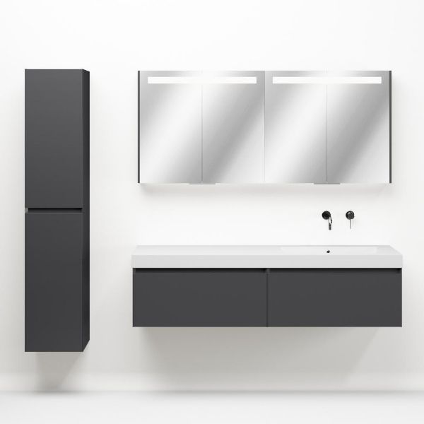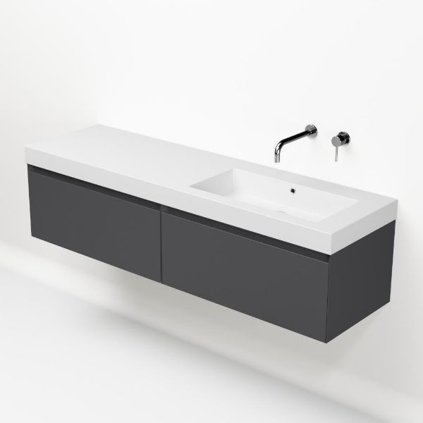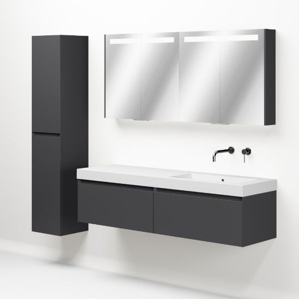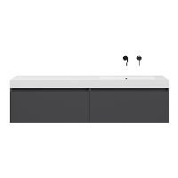 Greeploos badkamermeubel in de kleur antraciet mat is 160 cm breed. De wastafel is vervaardig in polystone en heeft de kleur wit. Dit badkamermeubel met deze wastafel is leverbaar tussen de 60 cm t/m 160 cm
