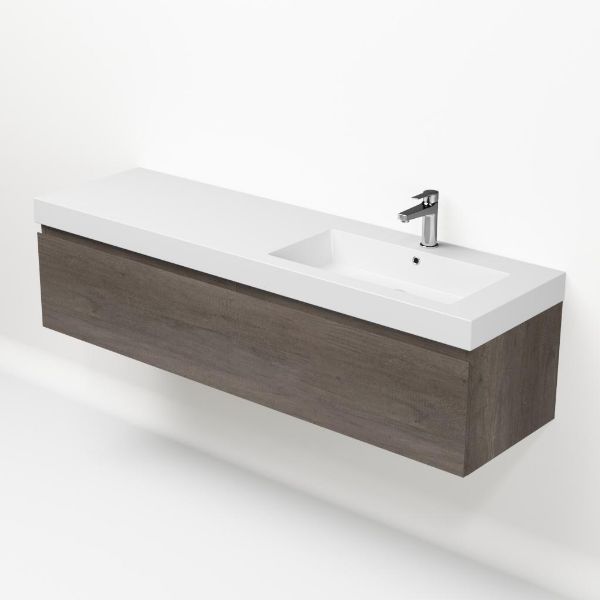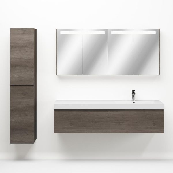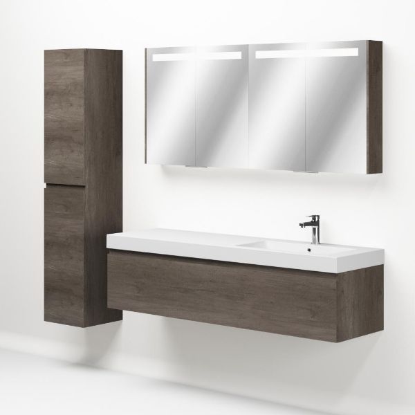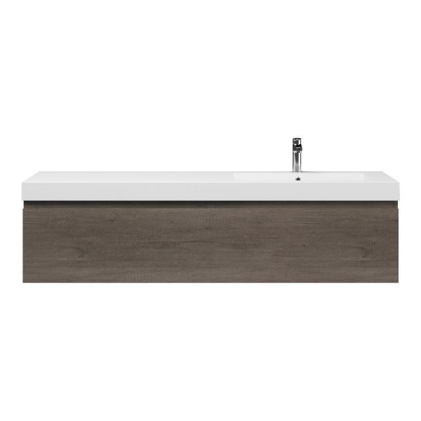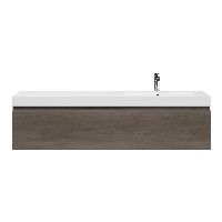 Greeploos badkamermeubel in de kleur olm donker grijs is 160 cm breed. De wastafel is vervaardig in polystone en heeft de kleur wit. Dit badkamermeubel met deze wastafel is leverbaar tussen de 60 cm t/m 160 cm