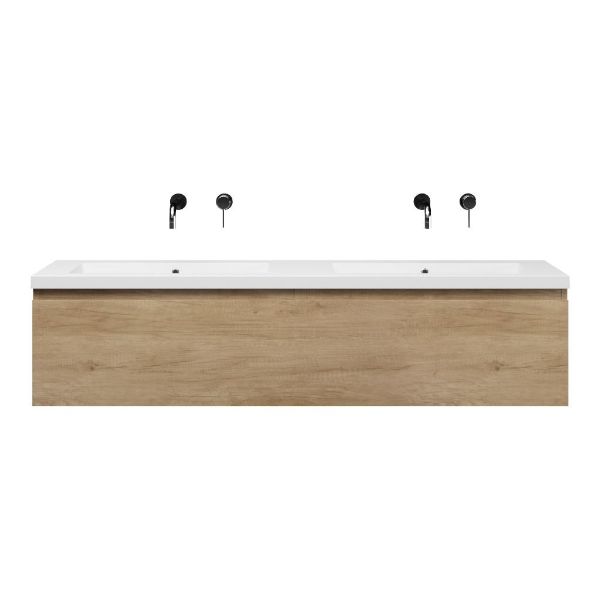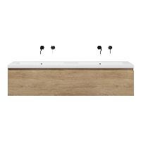 Greeploos badkamermeubel in de kleur olm is 160 cm breed. De wastafel is vervaardig in polystone en heeft de kleur wit. Dit badkamermeubel met deze wastafel is leverbaar tussen de 60 cm t/m 160 cm