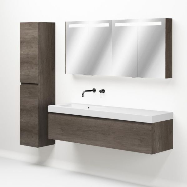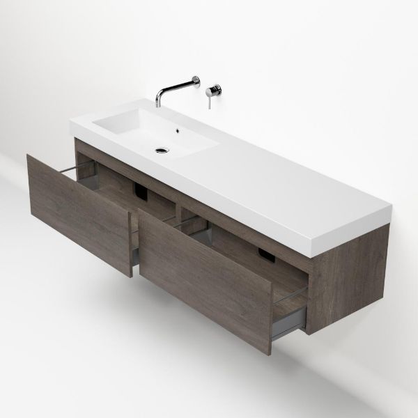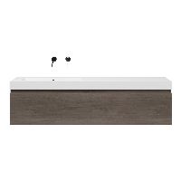 Greeploos badkamermeubel in de kleur olm donker grijs is 160 cm breed. De wastafel is vervaardig in polystone en heeft de kleur wit. Dit badkamermeubel met deze wastafel is leverbaar tussen de 60 cm t/m 160 cm