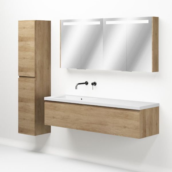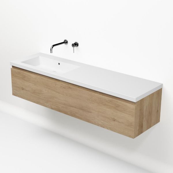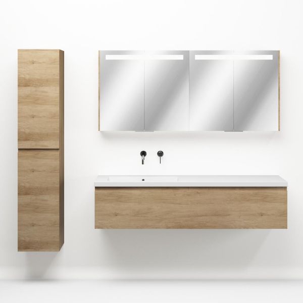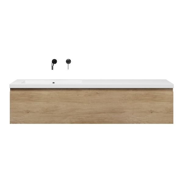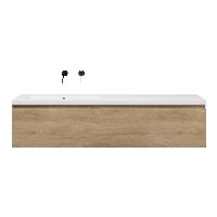 Greeploos badkamermeubel in de kleur olm is 160 cm breed.  De wastafel is vervaardig in polystone en heeft de kleur wit. Dit badkamermeubel met deze wastafel is leverbaar tussen de 60 cm t/m 160 cm