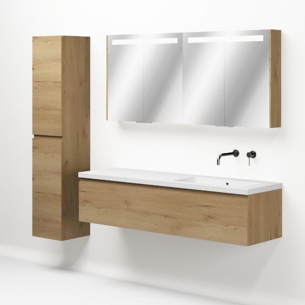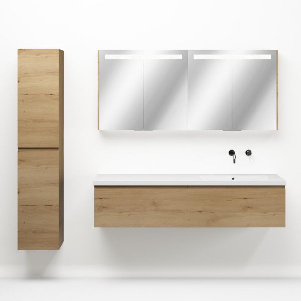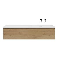 Greeploos badkamermeubel in de kleur eiken natuur is 160 cm breed.  De wastafel is vervaardig in polystone en heeft de kleur wit. Dit badkamermeubel met deze wastafel is leverbaar tussen de 60 cm t/m 160 cm