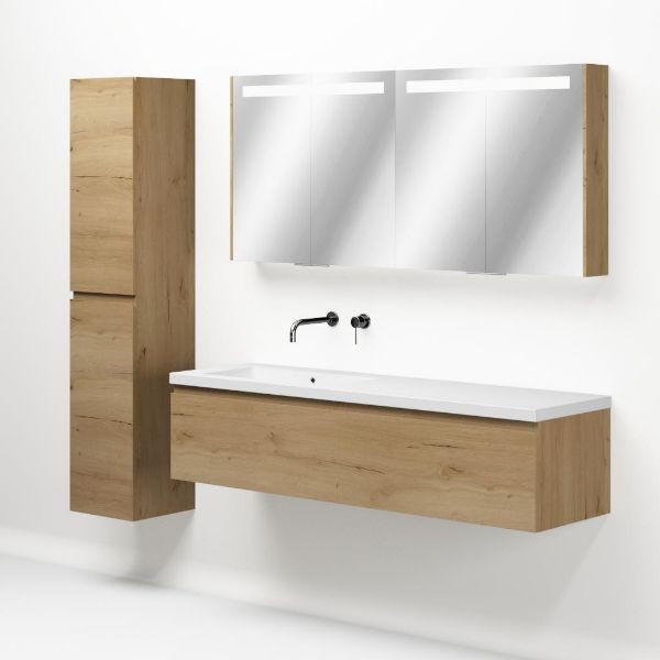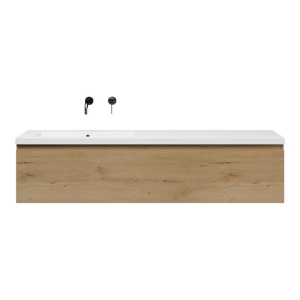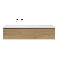 Greeploos badkamermeubel in de kleur eiken natuur is 160 cm breed.  De wastafel is vervaardig in polystone en heeft de kleur wit. Dit badkamermeubel met deze wastafel is leverbaar tussen de 60 cm t/m 160 cm