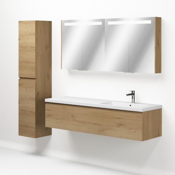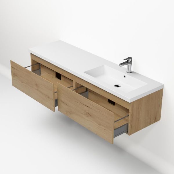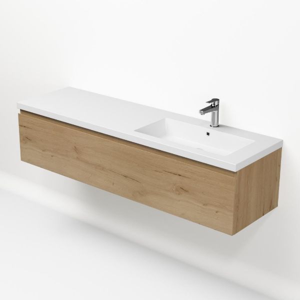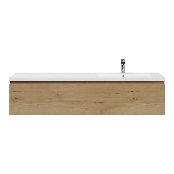 Greeploos badkamermeubel in de kleur eiken natuur is 160 cm breed. De wastafel is vervaardig in polystone en heeft de kleur wit. Dit badkamermeubel met deze wastafel is leverbaar tussen de 60 cm t/m 160 cm