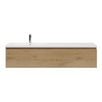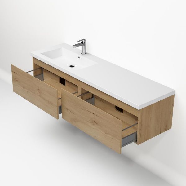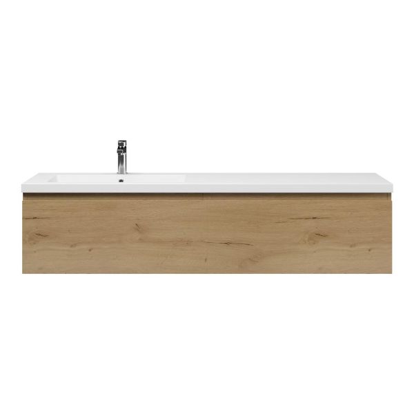 Greeploos badkamermeubel in de kleur eiken natuur is 160 cm breed. De wastafel is vervaardig in polystone en heeft de kleur wit. Dit badkamermeubel met deze wastafel is leverbaar tussen de 60 cm t/m 160 cm